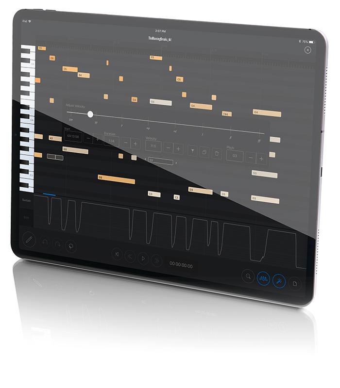 The Steinway & Sons Spirio | r allows users to record and listen to performances in stunning state-of-the-art high resolution. Spirio | r permits high-resolution recording on the instrument and editing via the included iPad, delivering a recording studio within the instrument. The system uses proprietary software to measure hammer velocity (up to 1020 dynamic levels at a rate of up to 800 samples per second) and proportional pedalling for both the damper pedal and soft pedal (up to 256 pedal positions at a rate of up to 100 samples per second).